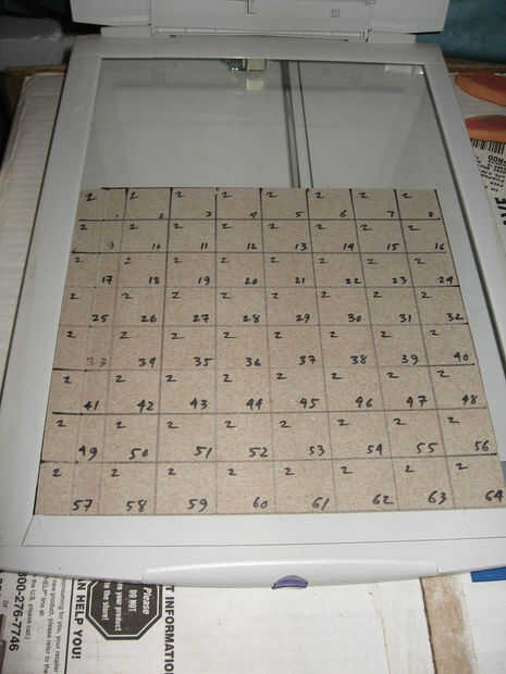Bien, qué tal esto: corte en cuadraditos uniformes; escanear en la computadora, cuidadosamente numeración, organizar y guardar (próxima explicación)... usan la colección resultante de imágenes escaneadas como entrada a un programa de Fotomosaicos. Un programa de opensource fotomosaicos y modificar así su salida me permite identificar cada pieza de cartón (que es por eso es necesario organizar, por lo que puede fácilmente recuperar cualquier cuadrado dado)... entonces puedo recrear los fotomosaicos de salida en "meatspace".