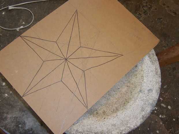 Creé una plantilla de estrella de cartón y había trazado en la pileta con lápiz. Esto me mantiene en pista cuando estoy aplicando las baldosas.