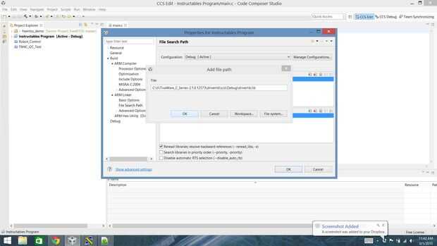Esta vez vaya a sección de vinculador de brazo y haga clic en ruta de búsqueda de archivo. Similar al último paso puede golpear el papel con un icono de signo más para agregar un nuevo archivo de biblioteca. Para mí este archivo estaba en el TivaWare carpeta driverlib -> ccs -> Debug.