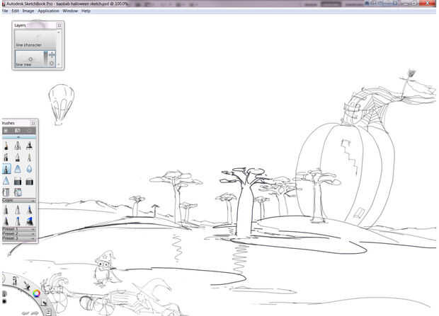 usé Sketchbook Pro para esbozar las líneas para el paisaje. Mis árboles Baobab parecen caber fácilmente en un paisaje con aguas tranquilas y una tierra plana. Algunas montañas bajas en la distancia y los árboles pequeños a punto el horizonte ayudan a crear un sentido de profundidad y espacio. Suave, también curvar Ribera hace el esbozo creíble. Bosquejo de lo que viene a su imaginación! Si algo no se ve 'bien', suelen buscar una imagen que es similar a lo estoy bosquejando y referencia que.