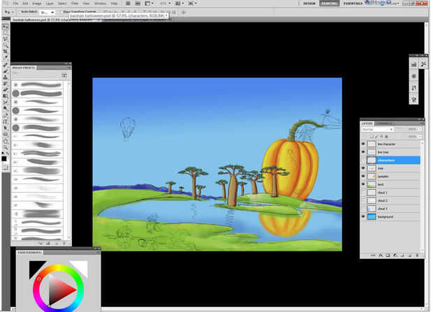 Para crear el reflejo de la calabaza en el agua, utilicé un pincel con opacidad baja (~ 70%) y el contraste de colores no es tan agudo. Esta técnica podría utilizarse para dibujar cosas que están oscurecidas por la niebla, polvo, etc..