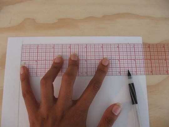 Usando Photoshop o una pluma, papel y regla, crean una plantilla de un azulejo de este tamaño. Photoshop es más fácil porque puede crear un rectángulo con el tamaño exacto y asegurar que cada cuadrado del mismo tamaño cuando se imprime.