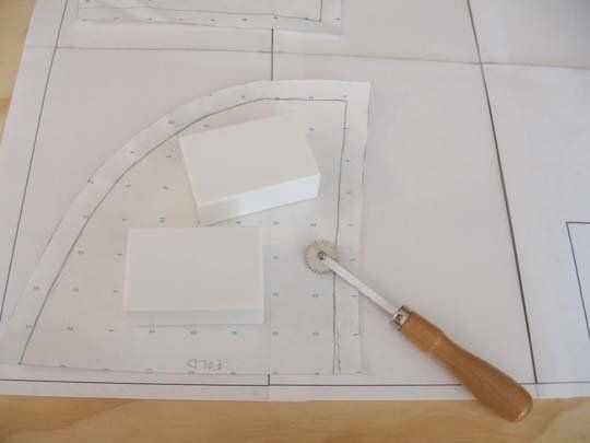 Seguimiento de sus patrones con tacon-ruedecilla. Marque la línea de costura real si sus patrones hechos a mano ya tienen margen añadido y luego cuando termine de añadir el margen de costura a los azulejos. Esta ayuda previene el error.