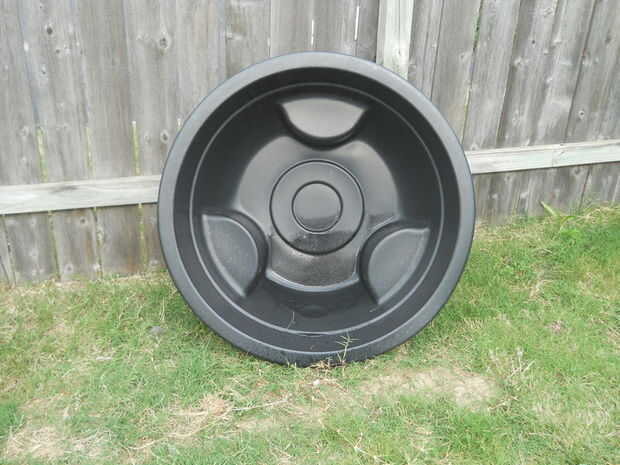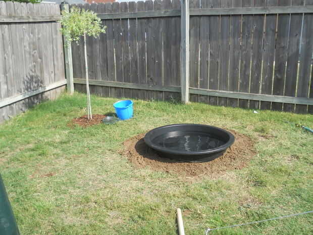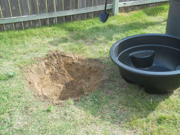 A 18" de profundidad y con una base grasa, no hubo mucha excavación necesaria para colocar a la profundidad que queríamos. (Mi esposo estaba feliz). Una vez, nos rellenada alrededor de él con la tierra excavada y agrega suficiente agua para asegurarse de que fue colocado y nivel.