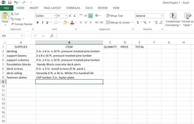 El ratón para navegar a la segunda columna directamente bajo el título tipo (celda B2) y escriba lo siguiente, después de escribir cada una prensa entrar para desplazarse a la celda directamente debajo el solo llenaste en uso. Mientras escribes los artículos más notará que Excel automáticamente extenderá la celda para acomodar el texto. Los elementos de orden son las siguientes: madera de pino tratada a 2 pulg x 6 pulg. x 10 presión de pies, 2 x 8 x 16 presión de pies tratados pino maderero, 4 pulg. x 4 pulg x 10 pies tratada a presión pino cubierta hormigón madera, Handy-bloque de muelles, polímero de 9 pulgadas x 3 pulgadas plateado cabeza plana tornillos para madera (pack de 5 lb.), terraza de 6 pies x 36 en. Blanco Pro kit barandilla y USP madera 3 pulg cierre placa. Seleccione el título de la célula dividiendo entre células B y C por la izquierda haciendo clic y arrastrando hacia la derecha hasta que su anchura es de 40.00. Cuando haya terminado su pantalla debe aparecer como figura 6.