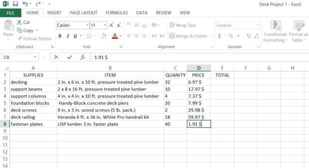 Izquierdo haga clic en la celda D2 (bajo el epígrafe titulado precio) y entrar en los precios individuales de los suministros. Después de escribir cada uno presione enter para seleccionar la siguiente celda. La lista de precios de unidad de orden es el siguiente: 6.97 $ 17.97 7.37, $ $, 7.99 $ 29.98 $ 59.97 $ y 1,91 $. Cuando haya terminado su pantalla debe parecerse a la figura 8.