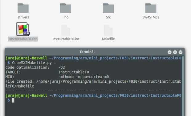 En el directorio de trabajo será archivos generados: Makefile, InstructableF0.cbp (el nombre de este archivo depende del nombre del proyecto CubeMX)
