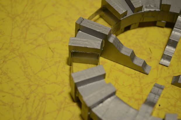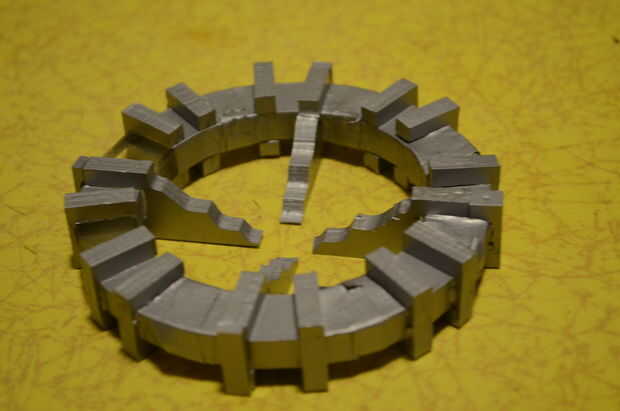 Una vez que son todos pegados en su lugar, cinta las secciones claro apagado y pintar con el color de aluminio. Mientras que se está secando, seguir adelante y montar el anillo ranurado y pieza de brazo 3 interior con pegamento.