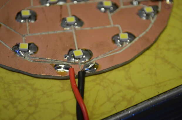 Luego agregué las líneas eléctricas, solo algunos regulares trenzado cables rojo y negro, en las mitades positivas y negativas de la diskO