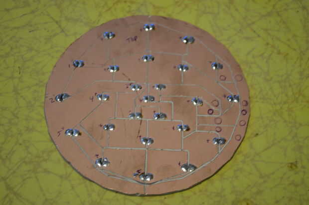 Entonces yo Asegúrese de que tenía el LED en la orientación correcta y la pongo en el cojín de la soldadura y calentar de un lado, luego el otro. Luego añadir un poco más en la soldadura para la buena medida y luego prueba con una batería de 9V para asegurar que todo funciona. Procedí a hacer el resto de los LEDs (tomó un tiempo)