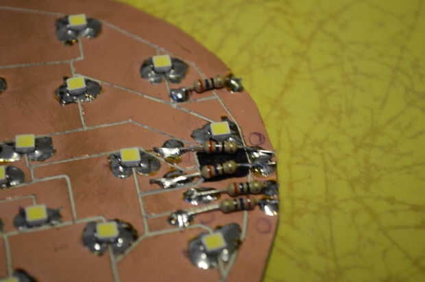 Siguiente paso fue añadir. que las resistencias en el, que utilizando la calculadora que vinculado antes necesito 27 5 resistencias de ohm, así que los excavadas y había soldado.