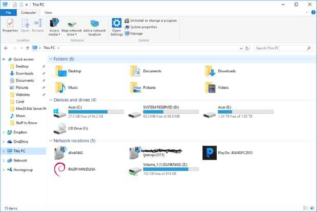 Por suerte, en algún momento más adelante (sospecho que fue después de que el servidor de medios había encontrado y catalogado todos los archivos de los medios de comunicación en el disco duro USB) un nuevo icono agradable por arte de magia apareció en la sección de "Este PC" del administrador de archivos, indicando la presencia del servidor de medios en ubicaciones de red. (Ver imagen de arriba). Cuando haga doble clic en este icono, ahora puedo navegar a través de la estructura de directorios del servidor de medios de comunicación desde mi PC de Windows, hacer edición de lo que se requiere para los archivos contenidos en el servidor.