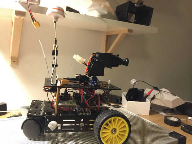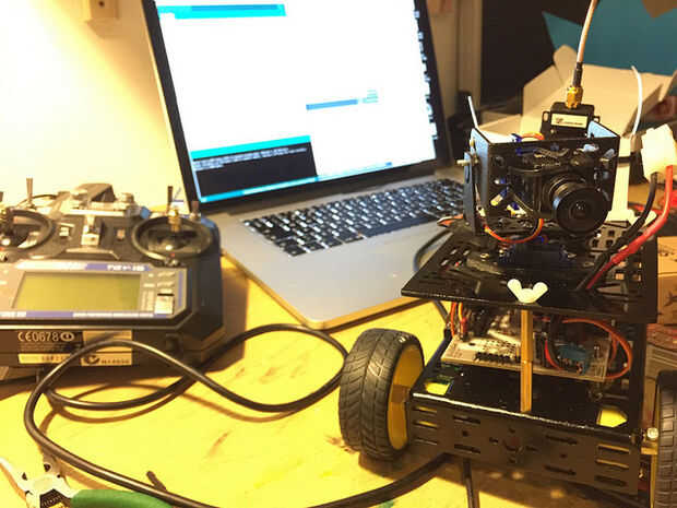 Empecé con un chasis 2WD y montar un Motoruino, una cámara y un servo de giro e inclinación, además de un Control remoto de Radio.