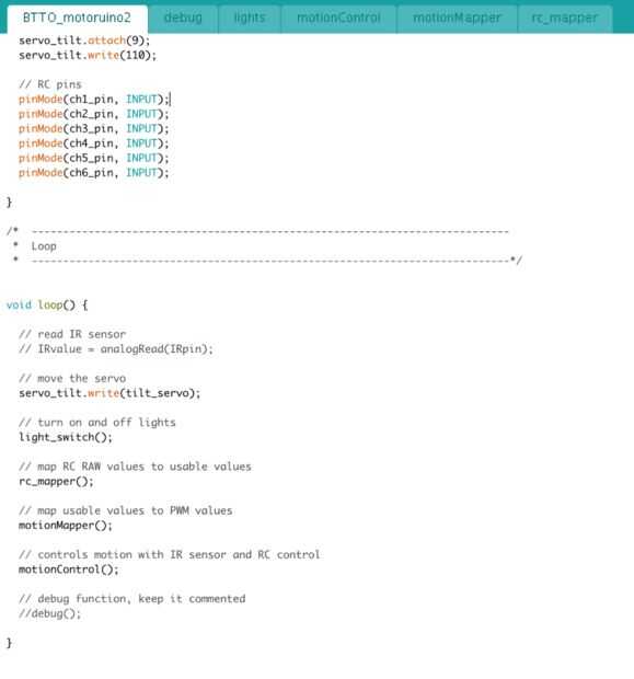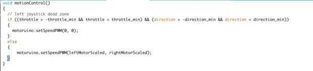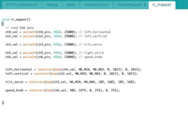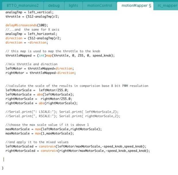 motionMapper() - todos los de origen para esta función pueden ser visto aquí. Tuve que hackear este poco de código para utilizar con el Motoruino2, porque los motores son en un uC de esclavo, estoy usando una función para configurar el PWM para ambos motores.