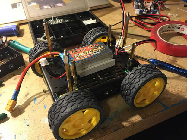 Después de terminado el montaje del chasis del 4WD, empecé colocando la batería en el nivel más bajo, este es uno de los componentes más pesados del robot, y hará que el centro de gravedad bajo bruja siempre es buena.