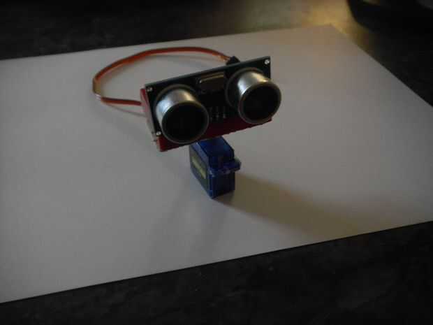Después de preparar el servo, fije la placa mini a la parte superior de su cuerno del servo (yo usé alguna cinta de la espuma que yo tenía por ahí) y luego fijar el sensor a, como se muestra en la foto de arriba.