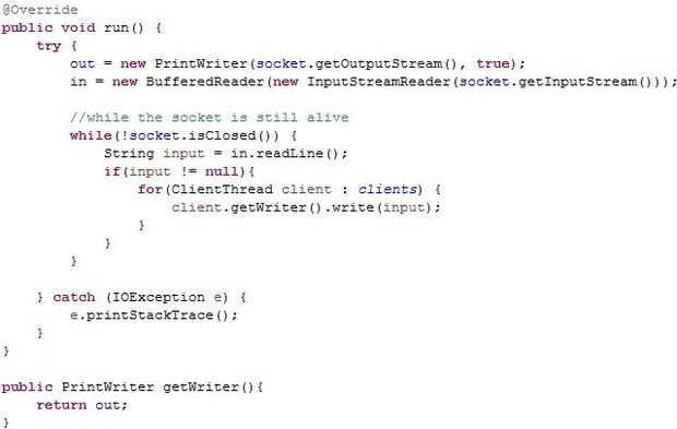 4. Crear un tiempo bucle en funcionamiento que busca cualquier entrada nueva e imprime la entrada a todos los clientes usando la lista de ClientThreads y el getter para el PrintWriter