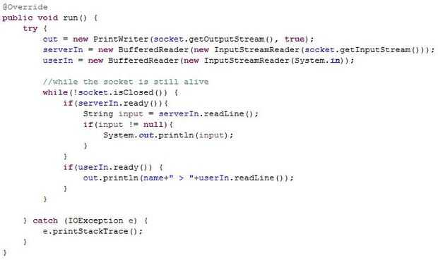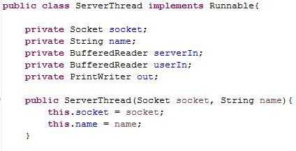 1. En ServerThread hacen un BufferedReader privado en recibir datos desde el servidor, otro BufferedReader para recibir datos del usuario y un PrintWriter escribir en el servidor.