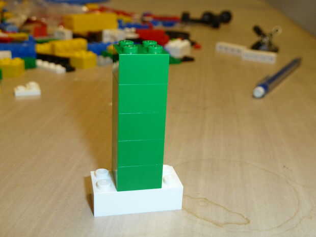 a continuación, coge un "2 x 4" pieza de Lego de cualquier color (yo escogí blanco) y luego adjuntarlo a la parte inferior de la torre en el centro. Dejando solo 1 fila de las protuberancias cuelgan hacia fuera. Es difícil de explicar para ver la imagen para más detalles.