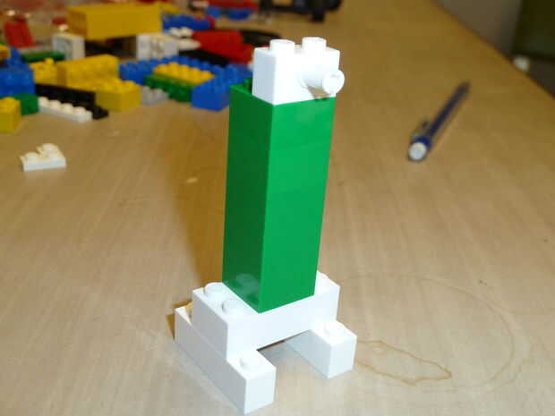 Ahora es el momento de instalar la pieza de Lego que los rotores de molino de viento a girar. Es una pequeña pieza blanca que usted necesita para hacer referencia a la imagen para ver. Destaca de cada otra pieza de Lego por lo que será bastante fácil de localizar. En mi foto, es la pequeña pieza en la parte superior de la estructura.