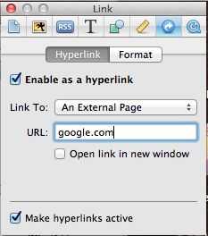 • Pegar la URL de la Página Web de destino en la sección "URL" de la ventana emergente. Asegúrese de que está marcada la casilla "activar hipervínculos".