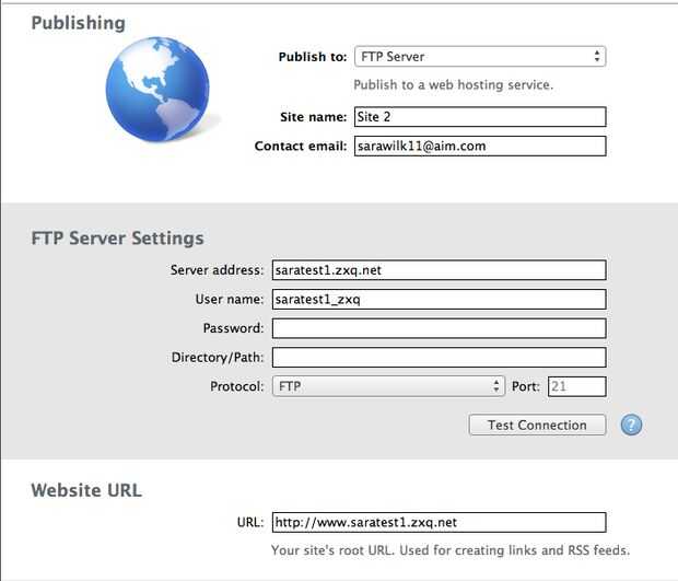 • Seleccione "publicar en servidor FTP" y el nombre su sitio, preferiblemente el mismo nombre que usted eligió para su título de la página web y escriba su dirección de correo electrónico.