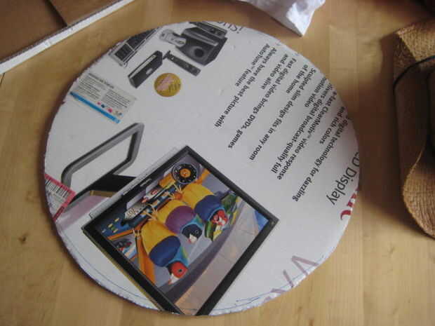 Utilizar un objeto circular de gran tamaño o un compás improvisado para trazar un gran círculo en la hoja de cartón y luego algunos robustas tijeras para recortarlo. A continuación, en el centro, cortar un agujero más o menos el tamaño del interior de su sombrero de vaquero. Tendrás algunos cartulina gruesa, buena. Como se puede ver, tenemos nuestro de la caja de un monitor más viejo que no voy a enviar a cualquier lugar más...