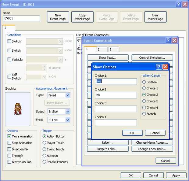 Después de la última pieza de texto, agregar otro evento. Esta vez, seleccione el botón con el texto agregar, "Mostrar opciones..." Aparecerá una ventana, tiene cuatro cuadros de texto. Los dos primeros dicen sí y no. El texto en los cuadros de texto serán las opciones que el jugador ve. Con estos cuatro recuadros, puede tener muchas cosas diferentes para elegir. Ahora pulse OK y en la pantalla será la siguiente: