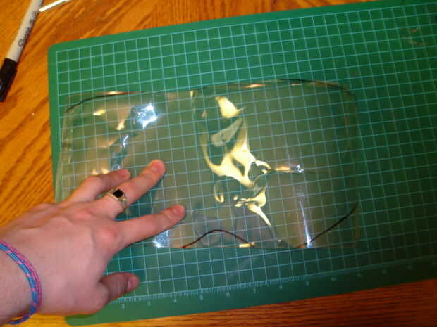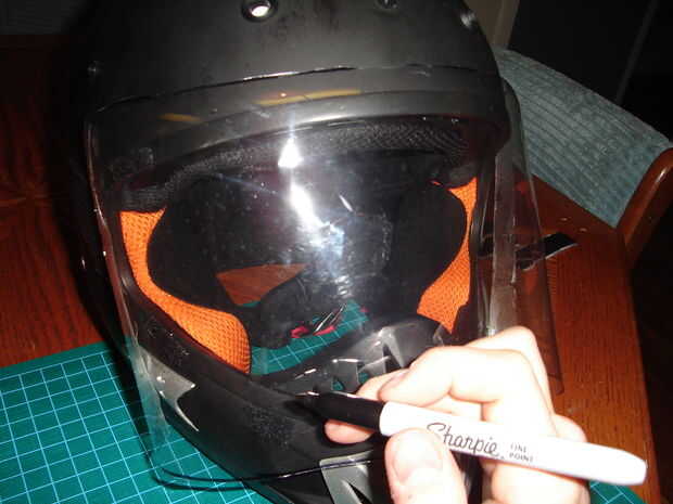 Mantenga el plástico hasta el casco y prepárate tu sharpie. Probablemente querrás cortarlo para que se amolde a los contornos del casco. Dibujarlo hacia fuera, luego recórtalo y ver cómo encaja, siempre cortar en el exterior de la línea marcada de modo que si equivocamos, tienes habitación para volver a hacerlo.