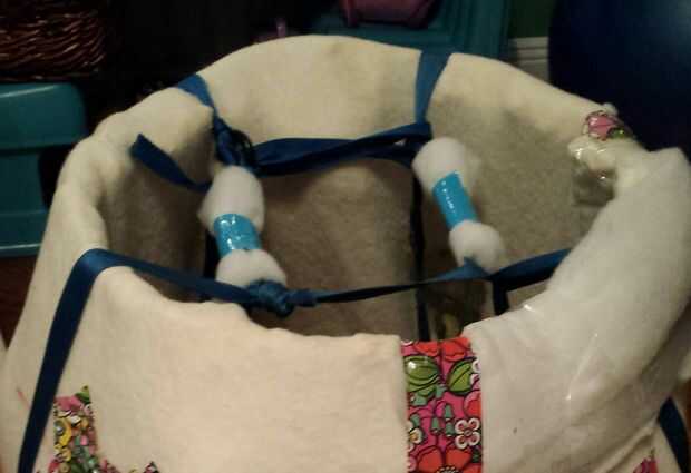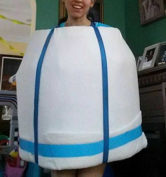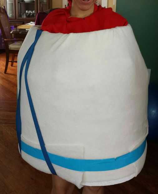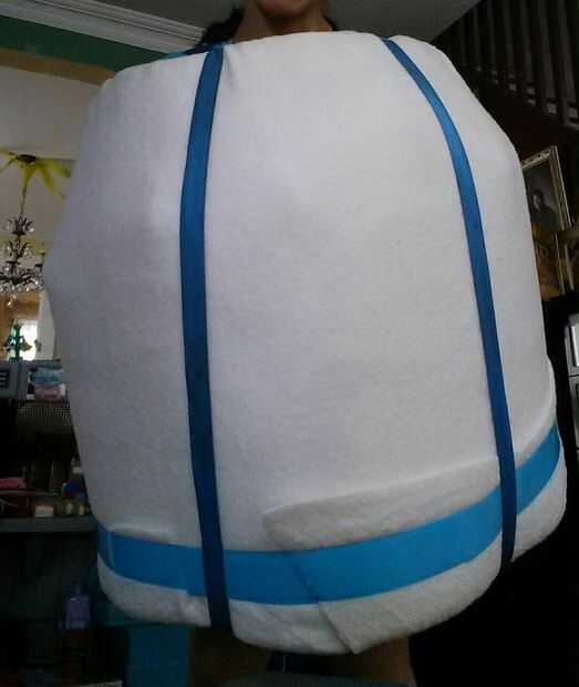 Cuando ambas correas de remolque listos para conectar a uno con el otro medido cómo es grande un agujero necesitaba apretar mi cabeza entre el hueco. Según mi esquema original, tenía una forma cuadrada en mente para la parte superior de mi arnés, para que el peso se cargue sobre mis hombros y mi cabeza perfectamente podría exprimir a través de la abertura. Esta medida será también muy útil al manipular la tela roja para hacer una porción de pimiento dentro de la oliva. Después de conectar las correas sueltas y lograr mi abertura cuadrada, envuelve algunos relleno alrededor de la parte de la correa que se apoye en mi hombro. De repente el traje no parecía que pesado.
