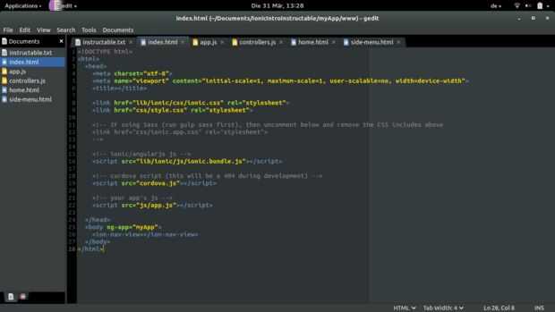 En el index.html nuevo no mucho ha cambiado: sólo el nombre de la aplicación y la cabecera se ha eliminado. Ion-nav-view se ha añadido, esta es una clase que carga la plantilla por defecto definida en app.js