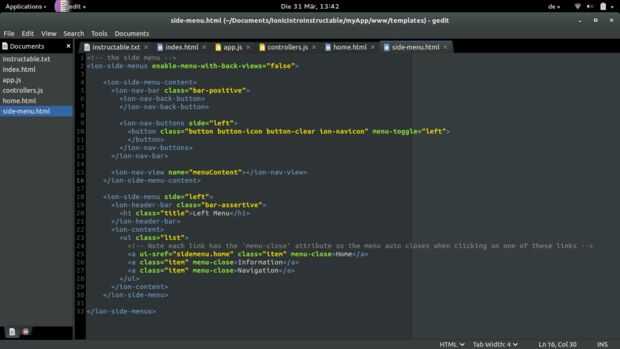 En el menú lateral puedes ver el código para el sidemenu. Crear un ámbito de lado-menús que contiene el menú lateral y contenido. El contenido contiene la barra de navegación en la parte superior de la página.