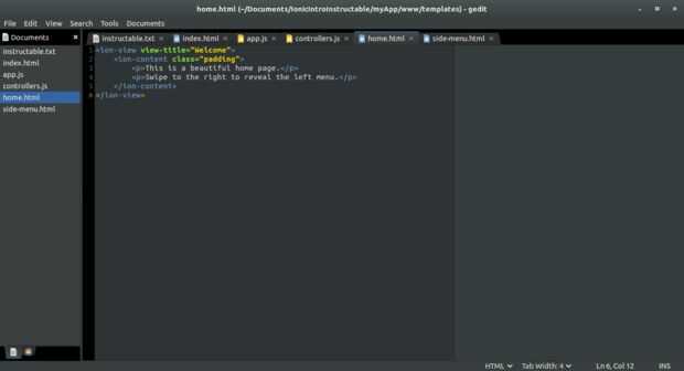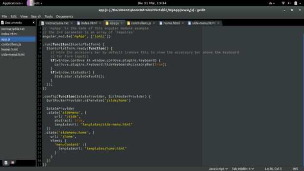 Aquí puedes ver que he creado algunos Estados, estos se utilizan para desplazarse en su aplicación. El sidemenu es un estado abstracto, que significa que no puede utilizarse directamente, sino mediante el uso de los Estados que son los hijos de éste (como en casa). Cuando utilizamos Inicio, se cargan home.html y lado-menu.html.