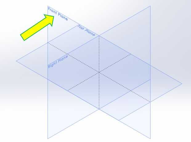 3 tres planos de la geometría se mostrarán en la pantalla; Frente plano, plano superior y plano de la derecha. Haga clic en el plano frontal para cambiar la orientación de la pantalla. La frontera del plano frontal vuelve naranja cuando el cursor se coloca sobre él.