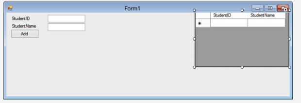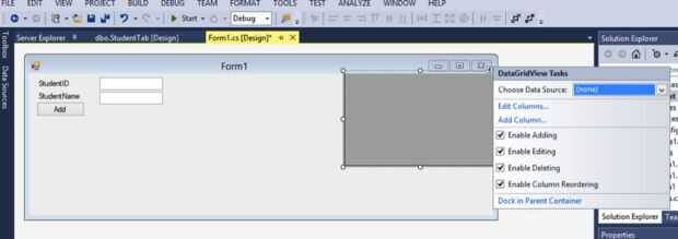 Estamos empezando a hacer algunos progresos reales con la base de datos y la forma será el punto de acceso para las entradas de datos en la base de datos. Vamos a añadir de la sección de datos de la caja de herramientas un DataGridView. Cambiar esta ventana recién abierta a la derecha, como hago por el bien de la organización. Necesitamos conectar este punto de vista de cuadrícula a un origen de datos. La esquina superior derecha de la vista de cuadrícula se tire hacia arriba de la ventana para ello. La base de datos que hemos hecho estará disponible para esta ventana.