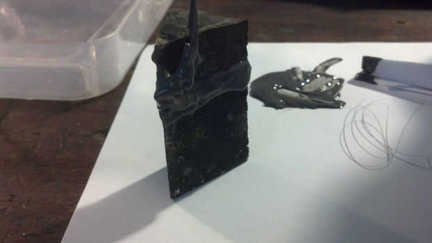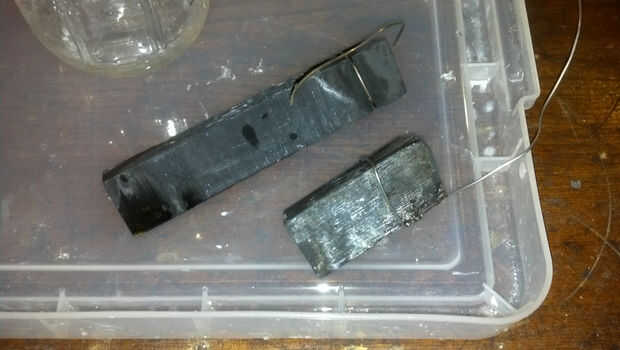 Nota: no estoy seguro que si no el JB Weld, pero el burbujeo del electrolito totalmente disuelto el alambre de acero en pocas horas - reemplacé con una vara de grafito. No sé el estado del epoxi, como lo es todavía en la batería. No tenía idea que corroería tan rápidamente.