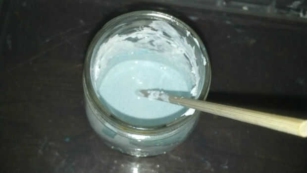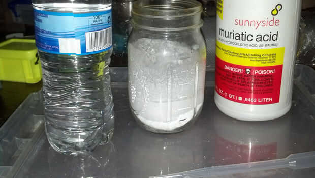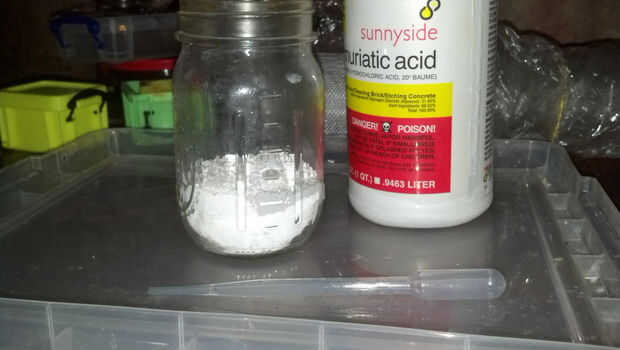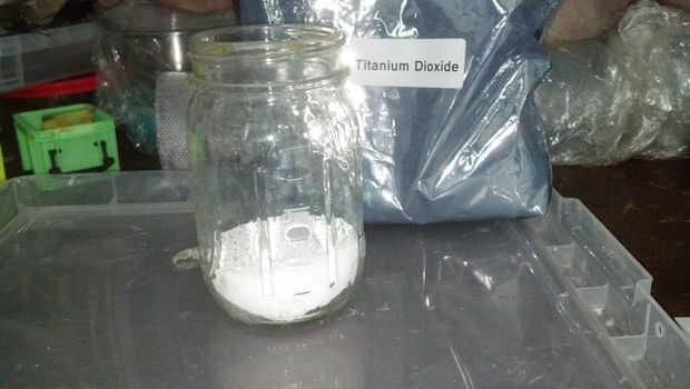 Empecé agregando ácido clorhídrico (5ml en un tiempo), pero se dio cuenta de que el TiCl quiere reaccionar con la humedad en el aire para hacer un vapor tóxico. Por lo tanto, agregar 100ml de agua embotellada en lugar de otro y procedió con goteros de 4 x 5mL de ácido clorhídrico en la jarra. El polvo forma una pasta espesa. Cerrado el frasco (sin apretar) para permitir la reacción proceder. La jarra se convirtió en cálido. Dejé el frasco por 24 horas.