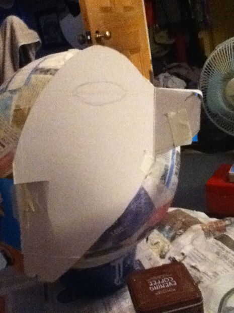 Entonces llena el espacio entre el cartón y el globo con diario arrugada encima. Esto es donde cometí mi primer error: me olvide de cortar los agujeros del ojo antes de fijar la cara al balón! Tuve que eliminar algunas de papel arrugado encima y use la cuchilla Stanley para recortar los ojos. Con eso hecho, reemplacé el periódico arrugado encima, con cinta de enmascarar alrededor de los ojos para dejar un espacio entre la cavidad del ojo y el globo por lo que podía cortar un agujero para los ojos más tarde. Descubrí más tarde cuan difícil era cortar a través el globo mache papier, por lo que pudo haber sido más sabio dejar secciones en forma de ojo del globo descubierto al aplicar el papel maché. Esto habría sido una buena medida de donde se colocaba los ojos (como descubrí más tarde, cometí un error crítico).