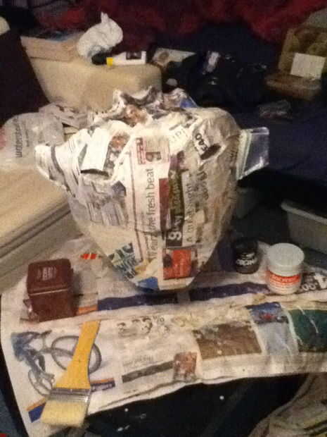 Luego cubrí toda la estructura en más de papel maché. No estoy seguro cuantas capas, pero recomendaría al menos dos. Una vez que se había secado, he rodado para arriba mitad-páginas del diario para hacer las ranuras para el cabello del Señor Morton y había pegado a éstos en su lugar con cinta de enmascarar más. Entonces esta había cubierto en más de papel maché.