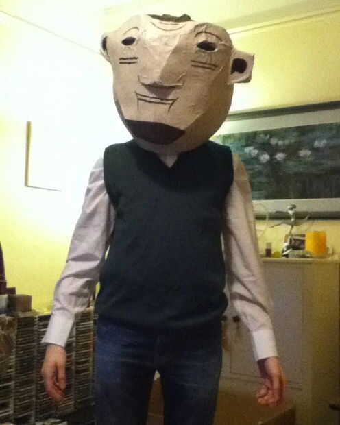 Lamentablemente cuando probé la máscara que descubrí que los agujeros del ojo eran realmente demasiado altos! Mientras que es posible ver un poco más a través de los agujeros que hice, no puedo caminar alrededor de la máscara sin alguien para guiarme! Esto significa que pasó la mayor parte del partido llevando su cabeza alrededor en lugar de usarlo. Posó para algunas fotos, pero tuvo que esperar en la ignorancia hasta que vi el flash a través de los agujeros del ojo!
