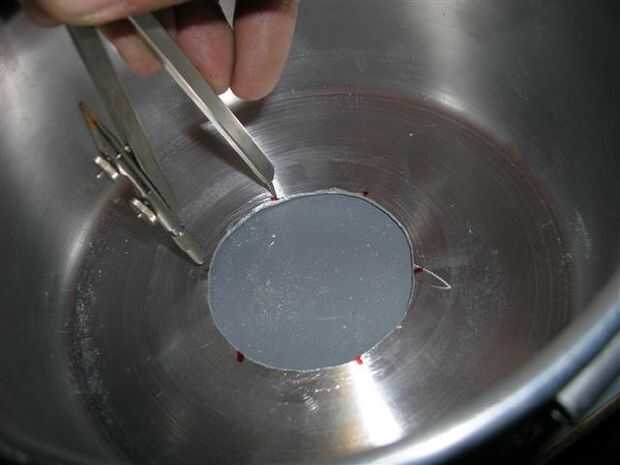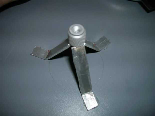 Ahora, taladre los orificios con una broca de 4mm y se preparan para utilizar los alicates del remache. Para montar el trípode you´ll necesita epoxy arcilla o pegamento de epoxy. Poner una tuerca pequeña en la parte superior del trípode. Esta tuerca celebrará el tornillo para cerrar la caja del filtro de aire.