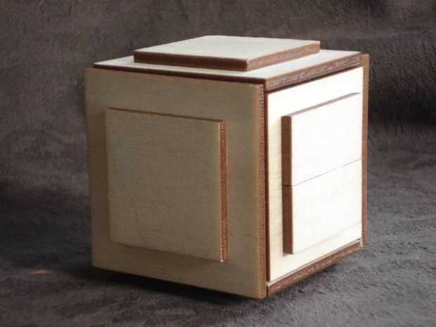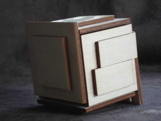 5. una vez que el pegamento se haya secado completamente, montar la caja. Construcción generalmente le dará suficiente información para poder montarlo, pero si usted necesita ayuda, la solución es también el sitio web de Bruce. Si es necesario, hacer ajustes menores con un cincel pequeño o un archivo. Me gusta mantener una pequeña baratija dentro mío para atraer gente a jugar con él ("por supuesto que no puedo decir lo que está dentro de la caja... sólo tendrás que averiguar cómo abrir!")