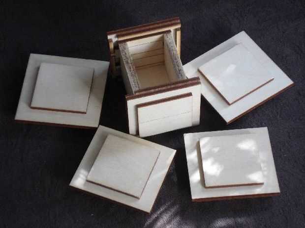3. una vez su arte como le guste, configurar su madera en el laser y corte las piezas. Escoge las piezas del láser, observando cuidadosamente que piezas van con qué lado de la caja. Hará que el proceso de montaje * mucho * más fácil si sigues las piezas para cada lado de la caja separados unos de otros. Usé un organizador del bordado/cordón (una de esas cajas de plástico con un montón de compartimientos separados), pero cualquier cosa que evitará que las piezas que mezclan ayudará. Además, puedes imprimir unos pocos (4-8ish) espesor extra individuales y dobles "palos" (4 mm x 4 mm x 64 mm) y 4 mm x 8 mm x 64 mm para ayudar con la alineación de las piezas como está pegando los lados (los "palos" más tienes, más lados puede trabajar simultáneamente como el adhesivo se seque). No tirar la basura chatarra aún!