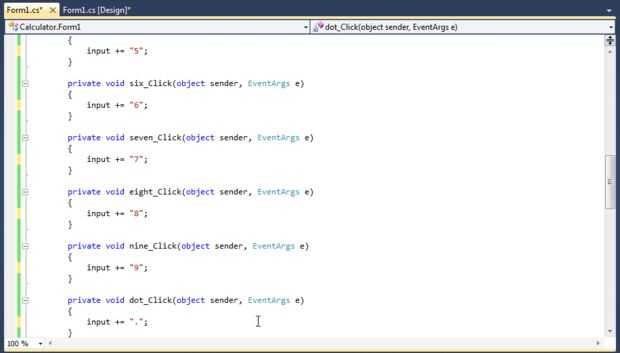 5.1. tipo de la línea entrada += "0"; entre las llaves para el controlador de eventos zero_Click. Esto añade un cero a la cadena de caracteres de entrada.
