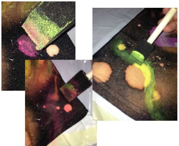 No desea mucho espacio negro vacío a la izquierda de la camisa. Rellena las áreas vacías del negro de su camisa con el color ligeramente untar pintura diferentes en con la esponja y untando en varios diseños. Llevar ligeramente la pintura alrededor en un movimiento de swirly para observar la galaxia.