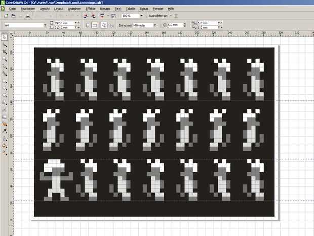 En Corel Draw me define una cuadrícula y comencé a dibujar cada lemming. Una vez que un lemming solo era completa podría copiar y pegar fácilmente para obtener tres filas. Como he estado trabajando con Corel por más de diez años, fue la parte fácil.