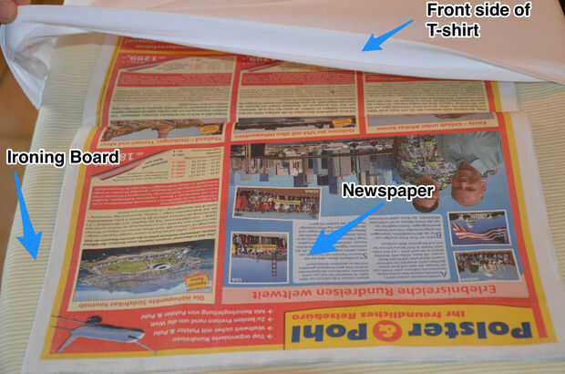 Después de tirar de la camiseta sobre la tabla, levante la parte delantera de la camiseta y deslice un trozo de periódico entre la camiseta y la tabla de planchar. El periódico hará pintura mucho más fácil para usted, ya que proporciona una superficie estable y permitirá que las escobillas se desplazan suavemente. Además, el periódico evitará pintura que se escapa en la tabla de planchado.