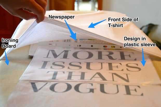 Coloque su diseño, que ya ha sido colocada en una funda de plástico, en la parte superior del periódico. Ahora podrá ver su diseño a través de la tela de la camiseta, como se muestra en la foto de arriba.