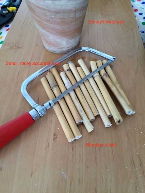 Esto camina suena mucho más fácil de lo que realmente es. Usted quiere conseguir unos cuantos palos de bambú o Cañas, porque el número de palillos de bambú alto necesario para llenar una maceta pequeña puede ser abrumadora y fácilmente subestimada. En primer lugar, medir la profundidad su maceta es con su regla. Ahora, corte de bambú en la longitud que mide, por lo que todos tienen la misma longitud y unregularly no sobresalen de la maceta. Diferencias de pequeña longitud no dañan el resultado final de la casa de la abeja. Cuando corte, mueva la sierra regularmente, concentrada y poco a poco. Después de cortar un palo de bambú, utilizarlo como un indicador para cortar el palo siguiente. Tratar de estimar cuántos palillos de bambú que se necesitan para la maceta entera y cortar tantas como Ud. va a necesitar.
