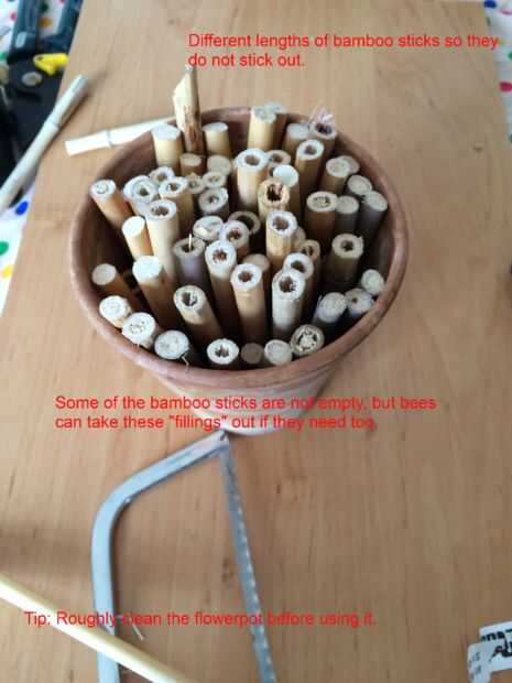 Si todavía hay espacio, considere cortar trozos más pequeños para que todo en la maceta quede firmemente. Los palillos de bambú que recabó no necesariamente tienen que tener un agujero en ellos ya, como las abejas pueden quitar el relleno si es necesario. En la foto de arriba usted puede ver cuanto debe parecerse a su maceta.